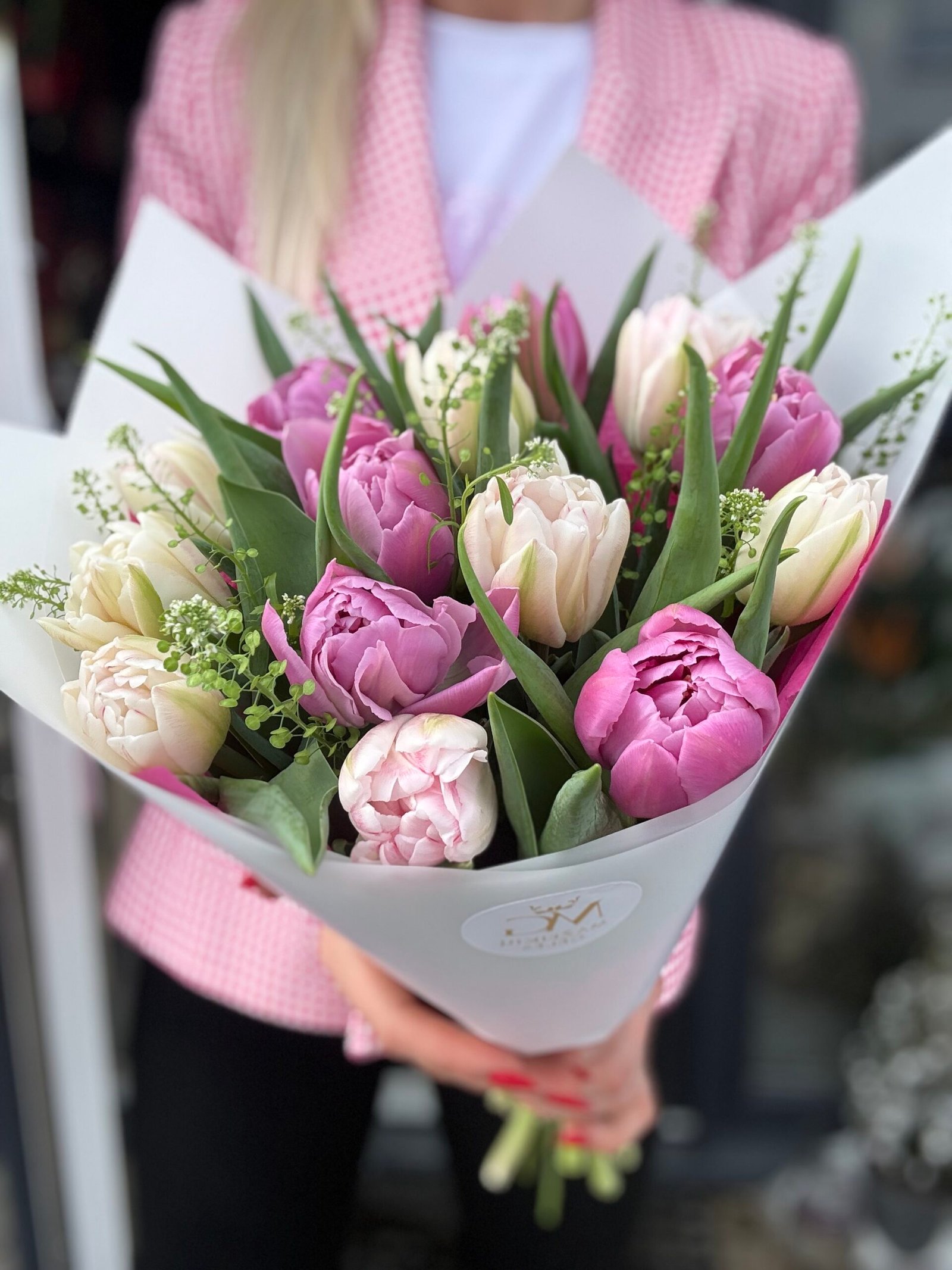 Labai gražios baltos – purpurinės bijūninės tulpės su žaluma 💐🌷🌿
