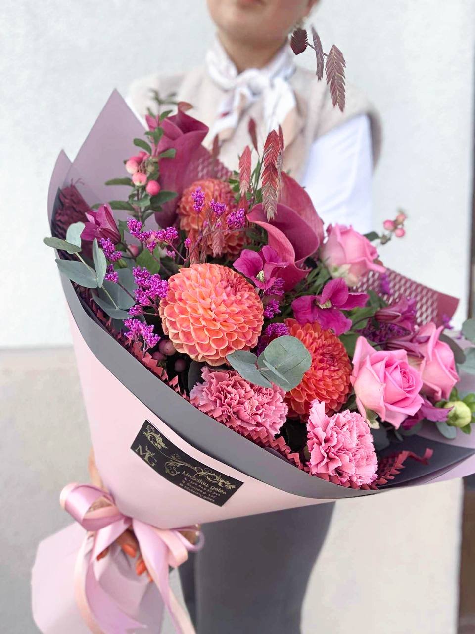 Ryški ir išskirtinė puokštė, kurioje susilieja sodrūs rožiniai, koraliniai ir purpuriniai žiedai. Ši kompozicija spinduliuoja šiluma, gyvybingumu ir elegancija – puikus pasirinkimas norint sužavėti ypatingą žmogų. 🌸💖
