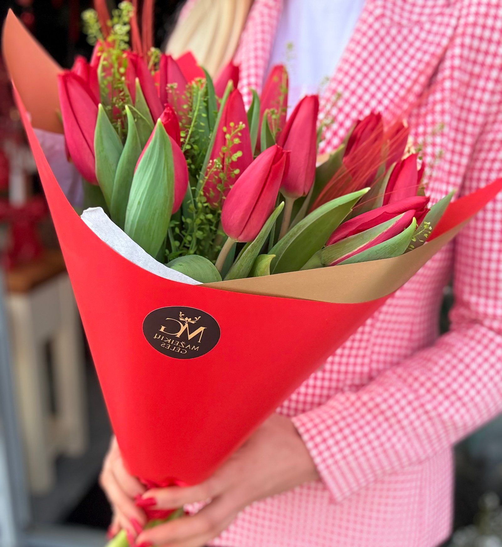 Tulpės supakuotos i raudoną popierių, kaip nurodyta nuotraukoje