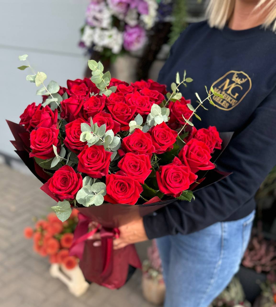 Ryški raudonų rožių puokštė su eukaliptu – tobulas derinys.